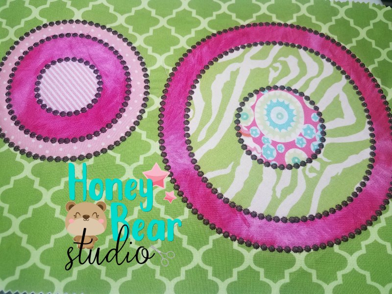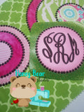 This cute applique monogram frame set does NOT include any pictured fonts. The frames are single, but you can easily merge them with software to create a layered look. These are a great basic file to have in your library for monograms in lots of sizes. You can stitch them with or without the applique to have a circle frame for quilts and other projects.